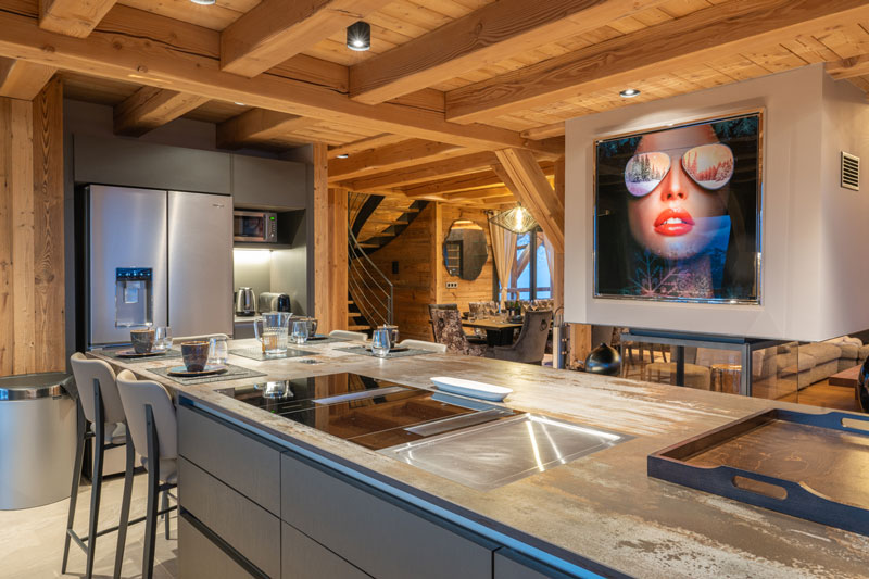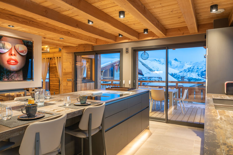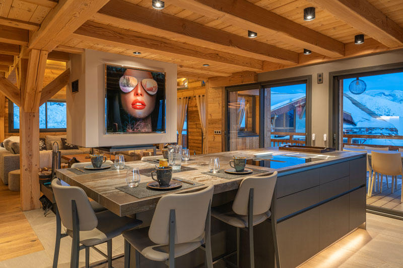 Les matériaux bruts — bois massif, pierre naturelle, métal noir — se mêlent aux volumes généreux et aux grandes baies vitrées pour offrir une vue panoramique sur les sommets alpins enneigés. Une grande terrasse avec table extérieure prolonge cet espace de vie, idéale pour des déjeuners ensoleillés face à la montagne.